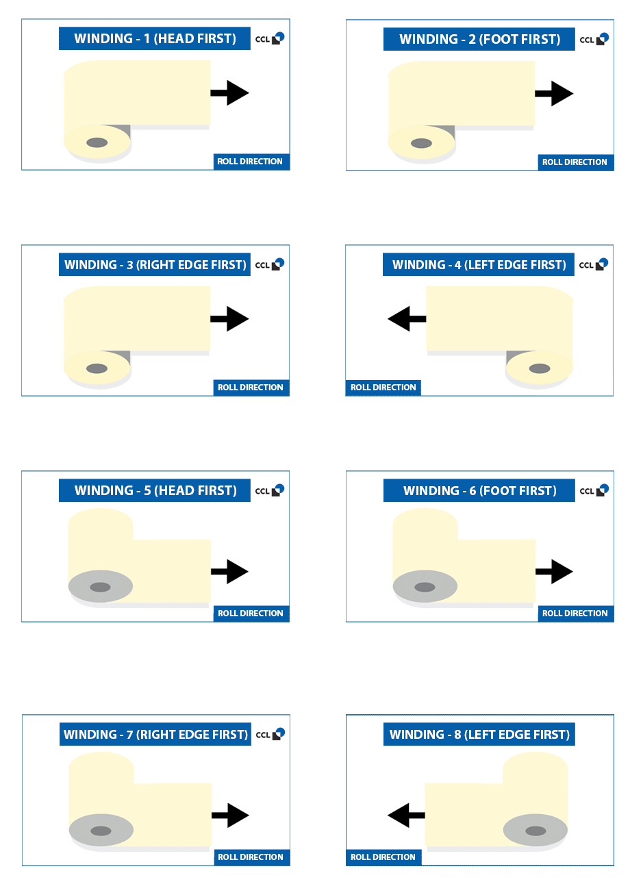 لمعالجة الملصقات الخاصة بك آليًا، من المهم أن تعرف اتجاه اللف الذي يتطلبه جهازك. يتم التمييز بين اللف الداخلي والخارجي وكيفية وضع الملصقات على اللفة، أي القدم أولاً، الرأس أولاً، بداية الكلمة أولاً أو نهاية الكلمة أولاً.